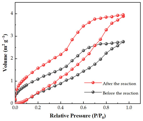 The BET pore size distribution results of the (SPS+ZVI)/WFPS-2 material before and after the reaction are shown in Figure 7. The specific surface areas before and after the reaction were 1.847 m2/g and 2.594 m2/g, respectively. Before the reaction, the material exhibited a relatively low pore volume, primarily due to the embedding of a significant number of particles on the material surface, which limited pore formation.