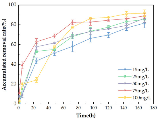 The degradation performance of the slow-release material at different initial aniline concentrations was investigated in a 7-day static batch experiment, and the results are presented in Figure 8. The degradation rate varied with the initial aniline concentration: for a 15 mg/L aniline solution, the degradation rate was 81.76%; for 25 mg/L, 85.29%; for 50 mg/L, 86.71%; and for 75 mg/L, 89.05%. At an initial concentration of 100 mg/L, the degradation rate was comparable to that of the 75 mg/L solution.
