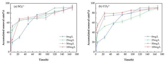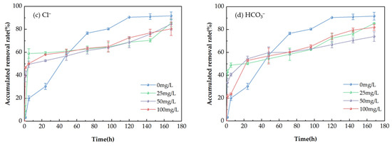 In contrast, HCO3− exhibited a more pronounced impact, reducing the degradation rate to 73.93% at 50 mg/L (Figure 9d). This effect is attributed to the formation of carbonate radicals, HCO3−, with lower reactivity, which slows the overall reaction kinetics. Interestingly, at 100 mg/L, the degradation rate rebounded slightly to 81.95%, likely due to the ability of ·HCO3− to react with electron-rich compounds and its potential to catalyze SPS decomposition, generating additional ·SO4−. As described by reaction Equations (7) and (8), these results indicate that while certain anions can inhibit aniline degradation, the slow-release material remains effective under various groundwater conditions, showcasing its robustness for in situ remediation applications.