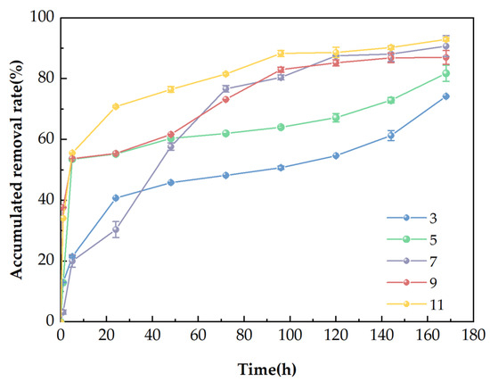 As pH increased, the degradation efficiency of aniline improved. At pH values of 3, 5, 7, 9, and 11, the degradation rates were 74.22%, 81.78%, 90.75%, 87.03%, and 92.95%, respectively. The system showed lower degradation efficiency in strongly acidic conditions (pH = 3), while the highest efficiency was observed under strongly alkaline conditions (pH = 11). Among weakly acidic and weakly alkaline conditions (pH = 5, 7, and 9), the optimal degradation occurred at pH = 7, where the removal rate reached 90.75%.