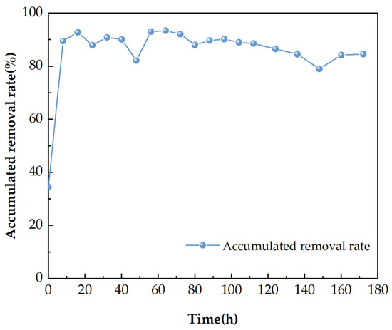 The degradation performance of the slow-release material remained consistently high over the 7-day experiment (Figure 11). Initially, the aniline removal rate was relatively low, at only 34.49%. This lower initial efficiency can be attributed to the dissolution of surface-bound materials upon first contact with water. As indicated by the characterization results, the surface predominantly consisted of calcium carbonate, with limited amounts of SPS and ZVI. Consequently, the aniline concentration in the effluent was higher at the start of the reaction.