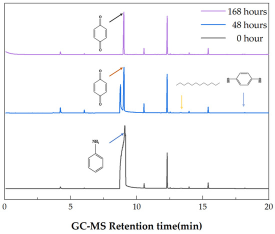 The degradation products of aniline were analyzed using GC-MS at 0 h, 48 h, and 168 h of the reaction, as shown in Figure 12. Aniline exhibited a distinct peak at 10.42 min. The primary intermediate products identified during the reaction were benzoquinone (21.76%), dodecane (6.57%), and hydroquinone (1.18%).
