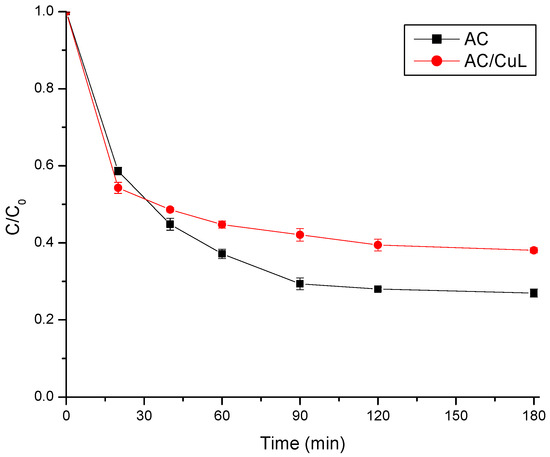Adsorption of DRX-6BN on AC and AC/CuL. Conditions: pH = ~6.0, CDRX-6BN0 = 20 mg/L, AC dosage = AC/CuL dosage = 0.42 g/200 mL of solution, T = 25 °C, stirring rate = 200 rpm.
