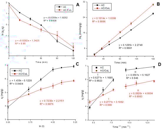 The lower adsorption of DRX-6BN on AC/CuL can be explained by the lower ABET (Figure S3B) compared to that of AC (Figure S3A). This phenomenon was also observed by Ruey-Shin et al. (2018), who reported the preparation of AC nanocomposites with Fe3O4, attaching Fe3O4 nanoparticles to the AC surface, with a drop in adsorption capacity from 384 to 60–114 mg/g [34]. Furthermore, pore blocking with consequent inaccessibility for adsorption of dyes and other pollutants due to impregnation is a known effect [31,78,79]. Functional groups were inserted into the AC (Figure S1A). Such additions can alter the dynamics of the interactions with pollutants and decrease the adsorption of specific adsorbates. Figure 2 illustrates the fit of the observed results to kinetic models.