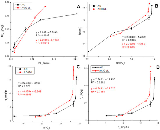Fitting of the adsorption results of DRX-6BN on AC and AC/CuL to the linear Langmuir (A), linear Freundlich (B), linear Temkin (C), and Henry (D) models. Conditions: CDRX-6BN0 = 20 mg/L, pH = ~6.0, AC dosage = AC/CuL dosage = 0.02–0.60 mg/200 mL, stirring rate = 200 rpm, T = 25 °C, and 120 min.