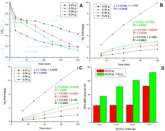 Removal of DRX-6BN over time (A), fitting of adsorption data in the presence of H2O2 using AC/CuL (B), fitting of adsorption data using AC/CuL (C), and comparison of removal by adsorption and adsorption with oxidation as a function of adsorbent mass (D). Conditions: CDRX-6BN0 = 20 mg/L, pH = ~6.0, stirring rate = 200 rpm, T = 25 °C, and 120 min.