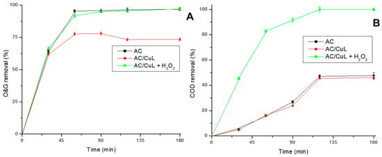 O&G removal (A) and COD (B) over time. Conditions: CO&G0 = 100 ± 5 mg/L, AC dosage = dosage AC/CuL = 0.04 g/200 mL, pH = ~6.0, stirring rate = 200 rpm, T = 25 °C.