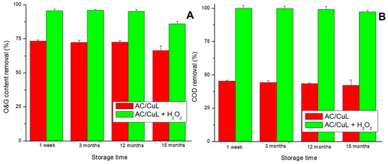 The stability of materials during storage is essential for industrial applications that have increasingly high requirements regarding efficiency, reliability, and sustainability. In the present study, the removal of O&G and COD from oily effluent was investigated for 120 min, at 25 °C, for 15 months, both in the presence and absence of H2O2. The results are shown in Figure 7.