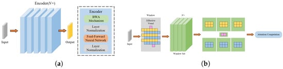 Transformer with BWA mechanism. (a) Encoder concrete structure. (b) Implementation process of the BWA mechanism.
