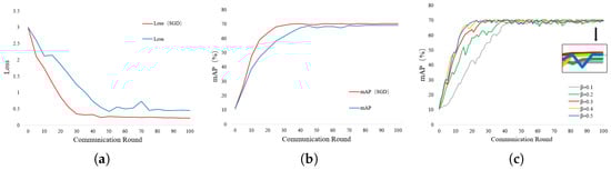 Figure 5 presents comprehensive experimental outcomes on the nuScenes dataset, showcasing the merits of our personalized FL approach integrated with SGD adaptation. As evident in Figure 5a, our method attains a faster convergence of the loss function, surpassing conventional FL by approximately 25 communication rounds and achieving a lower loss value of 0.2213 compared to 0.4531 without SGD. Similarly, Figure 5b illustrates a notable 1.06% enhancement in mAP, confirming the efficacy of our personalized strategy in accelerating user adaptation to local data distributions and enhancing model generalization. Moreover, Figure 5c delves into the impact of , revealing an optimal = 0.3 yielding the highest mAP of 70.23%, while lower and higher values exhibit slower convergence or instability, respectively. Notably, = 0.4 and 0.5 demonstrate faster initial convergence but ultimately yield inferior and more volatile results, highlighting the delicate balance between learning rate and stability.