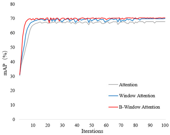 As shown in Figure 6, through observation, we found that traditional window attention achieved better results compared to standard attention, with an mAP increase of 2.02% (Attention = 67.88%, Window Attention = 69.9%). Notably, the proposed BWA mechanism demonstrated superior training performance over traditional window attention, achieving an mAP of 70.31%. Additionally, we also observed that the BWA mechanism converged faster than the other two approaches. These results underscore the effectiveness of the BWA mechanism in 3D detection tasks, emphasizing the importance of effectively processing point cloud data due to its unique characteristics in autonomous driving perception tasks.