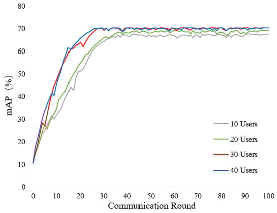 From a meticulous analysis of Figure 7, it is evident that the training performance exhibits a positive correlation with the escalating number of user vehicles, as the mAP consistently improves across different epochs as the number of participating vehicles increases, initially from 10 to 20 and subsequently to 30. This observed trend can be rationalized by the enriched training data pool that arises from the involvement of a greater number of participants. However, the training curves for 30 and 40 vehicles exhibit a near-perfect overlap, and the mAP values are almost identical, with respective values of 70.23% and 70.22%. This finding implies that the training performance attains saturation at a certain threshold of user vehicles, failing to demonstrate a linear or unbounded enhancement with further increases. Furthermore, curves converge around the 30th epoch, highlighting that the convergence speed of FL remains unaffected by the varying number of users. This minimal sensitivity of training outcomes to the vehicle count underscores the robustness and promising potential of FL frameworks in the realm of autonomous driving perception.