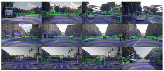 To unequivocally exhibit the strengths of our proposed methodology, we present in Figure 8 the forward-facing visual results evaluated using the nuScenes dataset. The blue points accurately align the intricate point cloud data with the corresponding images, showcasing precise spatial correlation. Additionally, the green 3D bounding boxes tightly enclose the various detected objects, emphasizing the model’s profound understanding of complex scenes. Notably, the visualized scenes highlight the exceptional capability of our model in accurately identifying even the smallest and most occluded objects, which proves its remarkable accuracy and groundbreaking achievement.