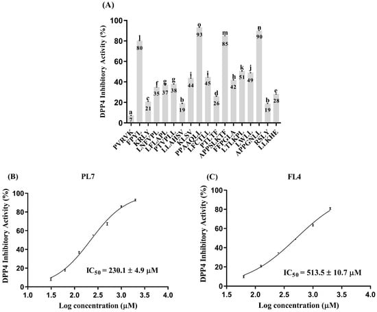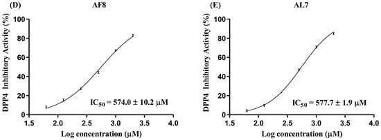 (A) The DPP4 inhibitory activity of identified peptides derived from CGS alcalase hydrolysate at the same concentration (1 mM). The mean DPP4 inhibitory activities for each peptide that do not share a common letter above the bars indicate statistically significant differences (p < 0.05). DPP4 IC50 values of (B) PPAAQLL, (C) FPYL, (D) APPSLKTF, and (E) APPGNLL.