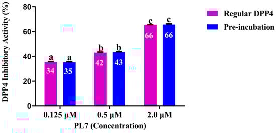 The determination of PL7 stability against DPP4 through a pre-incubation experiment. The mean DPP4 inhibitory activities for each tested sample with the same letter above the bars indicate no statistically significant differences (p > 0.05).