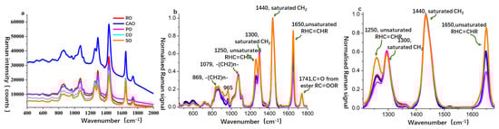 (a) Raman spectra of five types of oil samples, including CAO, RO, PO, CO, and SO; (b) normalized Raman spectra of five oil samples; (c) normalized Raman spectra within the wavenumber range of 1200–1700 cm−1 for five oil samples.