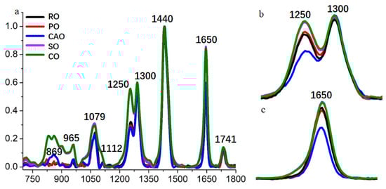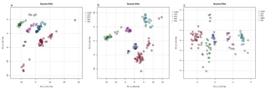 Figure 4a–c present the PCA scores of the aforementioned oil samples across various spectral regions. Specifically, Figure 4a encompasses the entire spectral range, Figure 4b narrows down to the wavenumber range of 1160–1350 cm−1, and Figure 4c further focuses on the wavenumber range of 1550–1800 cm−1. Notably, the first two principal components contribute to over 76% of the total variance, thus explaining a significant portion of the data variability. Upon examining the distribution of the PC scores as illustrated in all three score plots, it becomes apparent that CAO is distinctly separated from the other oils. Specifically, RO, SO, and CO cluster together, whereas PO and CO exhibit a closer distribution.
