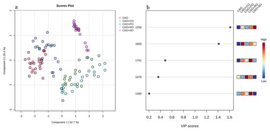 (a) PLS-DA score plot and (b) VIP scores for discriminating CAO from adulterated oil.