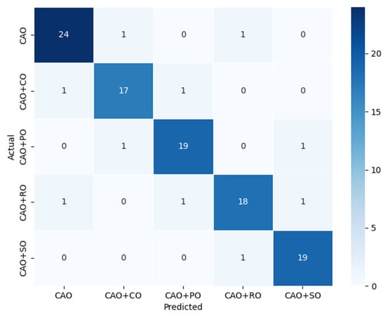 A PLS-DA model was developed using a total of 107 samples, distributed as follows: 26 pure CAO, 19 CAO+CO, 21 CAO+PO, 20 CAO+RO, and 21 CAO+SO. The results of the analysis are presented in Figure 5a. The first latent variable (LV1) explained 52.7% of the variance, while the second latent variable (LV2) accounted for 20.4%, resulting in a combined explained variance of 73.1%.