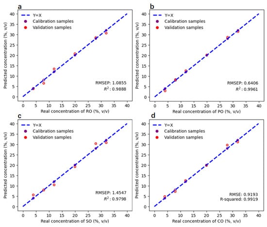 PCA was effective in exploring the data structure and identifying patterns among specific oil types, while PLS-DA demonstrated strong performance in classifying these oil types. However, these models were not designed to quantify the levels of adulteration involving cheap vegetable oils in CAO. To address this limitation, PLSR was applied to detect CAO adulteration in various inexpensive vegetable oils and predict the extent of adulteration. For the PLSR modeling, we utilized 22 samples for each of the following combinations: CAO+RO, CAO+PO, CAO+CO, and CAO+SO. Among these, 16 samples (3/4 of the total) were included in the calibration set, and the remaining 6 samples (1/4 of the total) formed the validation set. A PLSR model was built using the calibration set, and its quality was evaluated based on two key metrics: the calibration determination coefficient (R2) and the root mean square error (RMSE). The predictive performance of the models for CAO+RO, CAO+PO, CAO+CO, and CAO+SO is depicted in Figure 6.