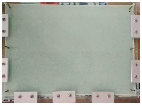 The sodium chloride (NaCl), calcium chloride (CaCl2), and magnemodel were composed of two glass plates, including the etched plate and cover plate. Magnesium chloride (MgCl2) and sodium bicarbonate (NaHCO3), purchased from Aladdin Reagents Co., Ltd., Shanghai, China, were used to prepare the simulated formation brine. The deionized water was obtained from our own laboratory. The two-dimensional heterogeneous transparent sand pack model was designed, as shown in Figure 1. The heterogeneous transparent sand pack model was fabricated by using different mesh quartz sand and epoxy resin to stick onto the glass. The size of the sand pack model is 30 cm × 30 cm × 2 mm. The model has six drilled ports, including three inlets and three outlets, which can be used to simulate the well pattern. The porosity of the sand pack model is 36.5%. The heterogeneous transparent sand pack model has a high permeability and low permeability zone. The permeability of the high permeability zone and the low permeability zone of the sand pack model is about 3.0 μm2 and 1.0 μm2, respectively.