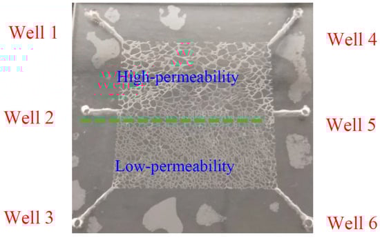 The micro-etching model was fabricated using the laser etching method. The micro-etching is attached together and sealed to form an enclosed pore space. The etched plate was designed as a heterogeneous pore size distribution. The pore size of the high permeability zone and low permeability zone is 50~100 μm and 10~50 μm, respectively. The size of the micromodel is 4 mm × 4 mm. The micromodel has six drilled ports, including three inlets and three outlets, which can be used to simulate the well pattern. The micro-model pattern is shown in Figure 2. All the experiments were conducted at 25 °C. The brine water and simulated crude oil were colored Naphthol Green and Sudan Red, respectively.