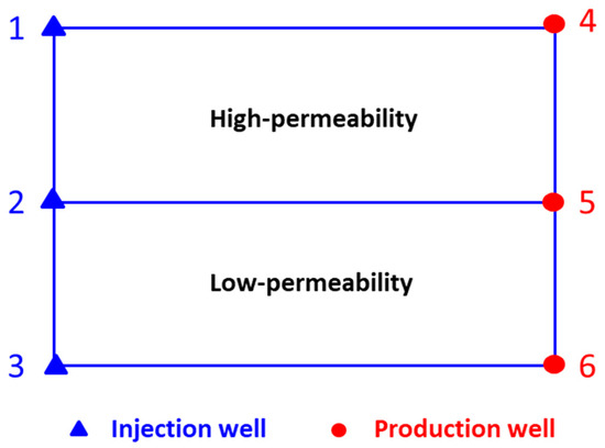 The basic conventional water flooding experiment is designed as three injection wells (wells 1#, 2#, and 3#) and three production wells (wells 4, 5, and 6), as shown in Figure 4. The experiment is stopped when the water flooding reaches a water content of about 98%.