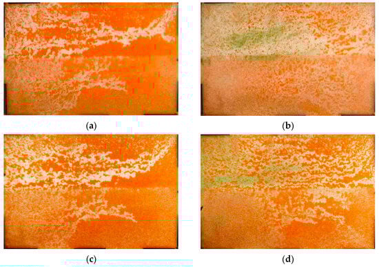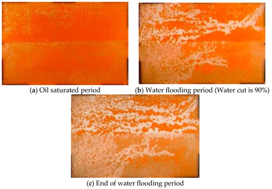 According to the transparent heterogeneous sand pack flooding experimental procedure, the remaining oil distribution characteristics at different flooding stages were recorded by using a video automatic acquisition device, shown in Figure 5. Under conventional water injection–production mode, water flooding was conducted until the water cut reached 98%. The streamlining and remaining oil distribution at different stages during the flooding process can be qualitatively analyzed.
