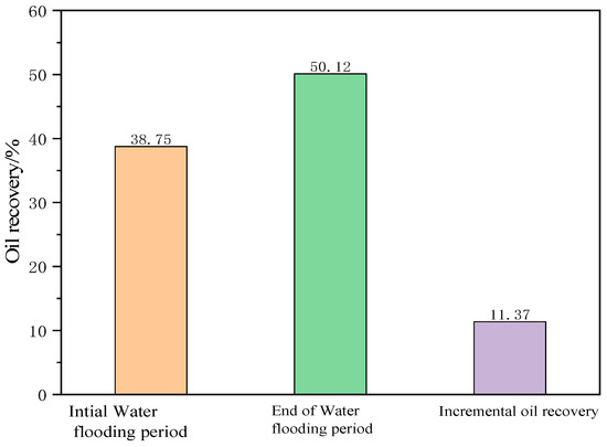 The image process software was used to characterize the oil saturation at different stages, and then the oil recovery was calculated according to the different oil saturation. Figure 6 depicts the incremental oil recovery results at different stages of conventional and coupling injection–production mode. The incremental oil recovery is defined as the difference between the initial oil recovery when the water cut is 90% and the final oil recovery when the water cut is 98%. Under conventional injection–production mode, during the initial water flooding period, the oil recovery is 38.75%. At the end of the water flooding period, the oil recovery is 50.12. Thus, under the conventional injection–production mode, the incremental oil recovery is 11.37%.