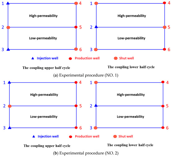 The experimental procedure of the transparent heterogeneous sand pack flooding test was as follows: (1) Oil saturated period: The sand pack model was vacuumed and saturated with formation brine. Then, the simulated crude oil was injected into the transparent plate sand pack until no water was produced at different injection rates from 0.1 mL/min to 1.0 mL/min. (2) Initial water flooding period: Then water flooding was conducted at the injection rate of 0.5 mL/min until the water cut reached 90%. (3) Final water flooding period. Then, the subsequent water was injected into the sand pack model until no more oil could be produced at the injection rate of 0.5 mL/min under different injection modes, as shown in Figure 3. For example, the conventional injection–production mode is when injection wells 1#, 2#, and 3# inject water slug simultaneously, and production wells 4#, 5#, and 6# produce simultaneously. However, for the injection–production coupling mode, during the coupling upper half cycle, when injection wells 1# and 3# inject water slug, the production well 5# produces. During the coupling lower half cycle, when injection well 2# injects water slug, the production wells 4# and 6# produce.