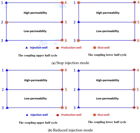 As shown in Figure 8, when the water cut is 90%, the remaining oil distribution after water flooding is similar under conventional and coupling injection–production mode. Compared with the initial water flooding period, it can be found that the remaining oil in the high permeability zone is less, while there is still a large amount of remaining oil in the low permeability zone, which echoes the experimental phenomenon of the plate model. At the end of the water flooding period under conventional injection mode and coupling injection methods, the remaining oil distribution in the high permeability layer and the low permeability layer are compared. It can be seen that the distribution of remaining oil in the high-permeability layer is similar, and the difference in the low-permeability layer is obvious. The remaining oil in the low-permeability layer under conventional injection mode is significantly higher than that in the low-permeability layer under coupled injection mode, indicating that the coupled injection can be significantly improved.
