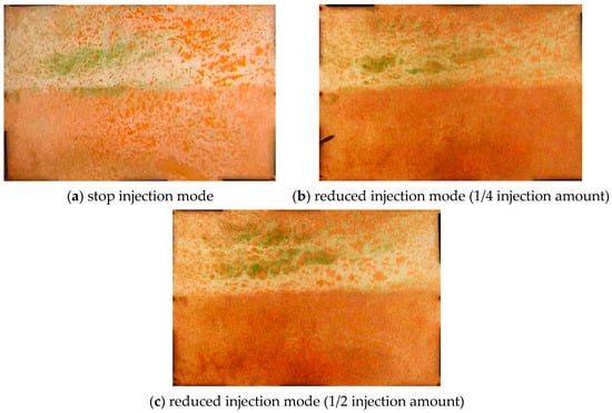 According to Figure 10, it can be observed that due to the difference between high and low permeability, the oil recovery in the high permeability zone is higher than that in the low permeability zone. Additionally, due to the fact that the injection well is not completely closed in the “reduced injection” mode, there are differences in the degree of water-swept area. When the “reduced injection” reaches half of the injection volume, the water-swept area in the low permeability zone is the smallest.