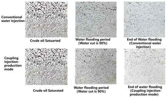 When water flooding is conducted until the water cut reaches 90% under continuous injection–production mode, then coupling water injection is carried out until no oil is produced according to different coupling injection–production well layout modes. The naphthol green B was used to darken the subsequent water injection color for easy observation under the coupled injection–production mode. The coupled injection–production well pattern was designed as shown in Table 1. Figure 7 shows the oil–water distribution and remaining oil distribution at different flooding stages under different injection–production well patterns.