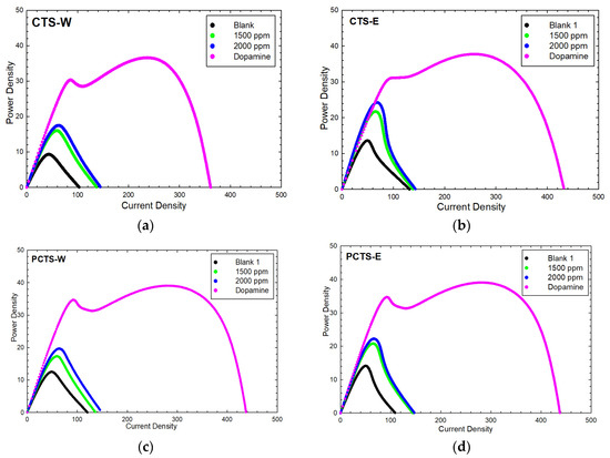 Power density profiles of Cassia seed extracts compared to blank and dopamine. CTS-W showed the highest PD amplification ratio (ca. 1.87-fold) among all of the extracts. (a) Power density profile of CTS-W; (b) power density profile of CTS-E; (c) power density profile of PCTS-W; (d) power density profile of PCTS-E.