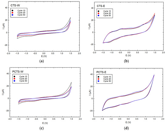 Cyclic voltammogram (CV) profiles of Cassia seed extracts at 10, 20, and 50 cycles exhibit the electrochemical stability of the samples, suggesting the presence of ES species that are not easily degraded after electrochemical attenuation; (a) CV profile of CTS-W; (b) CV profile of CTS-E; (c) CV profile of PCTS-W; and (d) CV profile of PCTS-E.