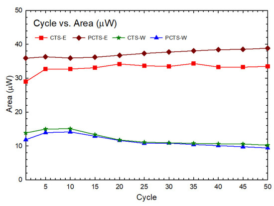 To assess the electrochemical activities of Cassia seed extracts, studies of cyclic voltammetry (CV) were conducted. As the literature [1] mentions, CV is a valuable tool in determining the electroactive contents of electron-shuttling compounds and antioxidants based on their electrochemical stability and reversible electron transfer characteristics. The cyclic voltametric profiles can be used to assess the presence of electrochemical catalysts by exhibiting both reduction and oxidation potential peaks. In contrast, antioxidant-dominated species only exhibit significant oxidation peaks. The presence of ES species can be associated with their capability to resist electrochemical attenuation even after being exposed to repeated redox cycles, indicating their potential for electroactive sustainability. However, no potential peaks were revealed in Cassia seeds’ CV profiles (Figure 2), indicating that such samples were not antioxidant, antireductant, ES, or that the measured conditions were not to achieve such peak(s). Aside from reduction and oxidation peaks, the areas enclosed within the CV loops could exhibit electrochemical contents in the samples. Figure 3 shows the close-loop-area curve of different cycle numbers for the extracts analyzed in this study (see Table S3 for the numerical values of the area). While there is an insignificant change observed with the enclosed loop areas of the Cassia seed extracts that clearly indicates the electrochemical stability of the samples [17], the actual measure of the area must be accounted for, since the abundance of easily decomposed or/and converted electroactive compounds in the extracts can be supported by the presence of larger areas in the enclosed CV loops. This factor would considerably influence bioelectricity-generating performance (PD).
