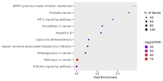 Aside from the Hepatitis B virus, several cancer-related pathways were associated with the bioactive metabolites of Cassia, as indicated by the KEGG pathway analysis (Figure 4). The association of cancer-related pathways indicates the multitude of biological activities targeted by the bioactive compounds of Cassia. Cancer affects multiple body organs and cells, allowing it to target various pathways. Similarly, herpes virus infection was also significant in the pathway associated with the bioactive metabolites from Cassia (Figure 6). It was evident that bioactive compounds from C. obtusifolia can exhibit antiviral activity by targeting the genes related to the pathways shown.