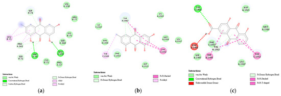 Two-dimensional representation of interactions in protein–ligand complexes for HBV showing the interactions that contribute to the stability of the formed complex. (a) Emodin–TNF complex; (b) Emodin–TP53 complex; (c) Rhein–TP53 complex.