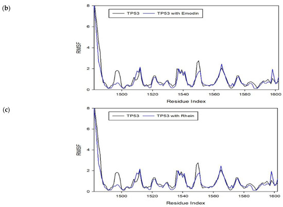 RMSF plot for protein–ligand complexes from a molecular dynamics simulation showing the deformations and conformational changes that occurred within the complex compared to the protein alone. (a) RMSF plot for TNF–Emodin complex in comparison to TNF protein; (b) RMSF plot for TP53–Emodin complex in comparison to TP53 protein; (c) RMSF plot for TP53-Rhein complex in comparison to TP53 protein.