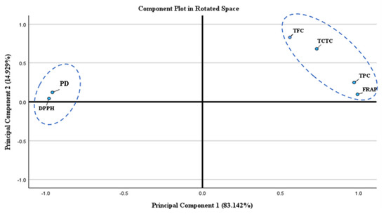 PCA was implemented to provide conclusive remarks and exhibit correlations among these six variables (i.e., TPC, TFC, TCTC, DPPH, FRAP, and PD). It reveals that PC1 captures 83% of the total variance while PC2 captures ~15% of the total variance of these variables. The component plot shows a positive association between FRAP, TPC, TCTC, and TFC towards PC1, while PC2 positively correlates with all of the variables. The spatial rearrangements of the variables shown in Figure 8 towards PC2 highlight the correlation between DPPH and PD with TPC, TFC, TCTC, and FRAP, suggesting a positive association among these variables in the y-axis. These associations are indications that the phytochemical content of C. obtusifolia seed extracts influence its antioxidant activity in terms of the FRAP assay, as indicated by the positive correlation established with PC1.