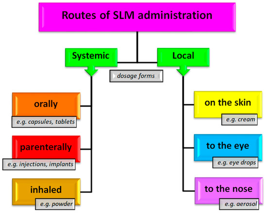 Potential routes of administration of SLMs in different dosage forms.