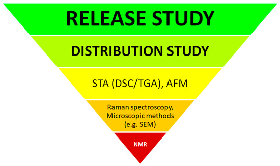 In summary, all of the instrumental methods characterized above, together with the release and distribution studies described in the following sections, are summarized in Figure 3. The graphical layout presents all of the techniques in order, from the most to the least valuable and useful for describing the properties and assessing the quality of the studied SLM formulations, according to the authors’ assessment and own experience. The primary goal of all analyses and the presented summary was the most accurate qualitative and quantitative identification of APIs and the characterization of their distribution in SLM formulations.