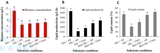 The effect of nitrogen source on (A) biomass concentration, (B) lipid productivity, and (C) lipid content grown in flask culture at initial pH of 5.0, 30 °C, and 150 rpm. Data are shown as mean ± SD from three experiments (n = 3). Glu: glucose, Gly: glycerol, AS: ammonium sulfate (p < 0.05, Fisher’s test). Different letters in the same column in the table indicate that there were significant differences according to the Tukey test (p ≤ 0.05).