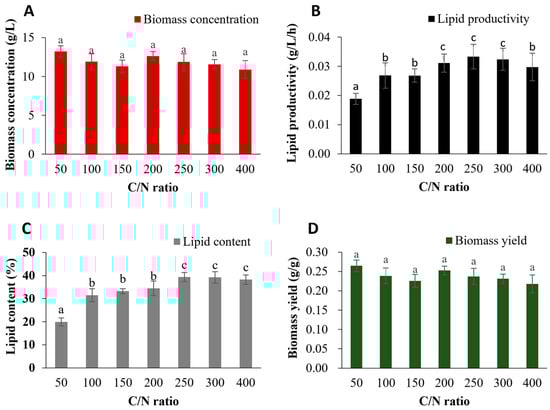 Effect of C/N ratio on (A) biomass concentration, (B) lipid productivity, (C) lipid content, and (D) biomass yield of R. toruloides grown in flask culture at initial pH of 5.0, 30 °C, and 150 rpm. Each point represents the mean value ± SD of three samples of a representative experiment of three runs (p < 0.05, Fisher’s test). Different letters in the same column in the table indicate that there were significant differences according to the Tukey test (p ≤ 0.05).
