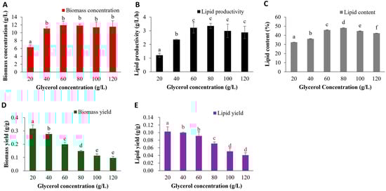 Effect of glycerol concentration on (A) biomass concentration, (B) lipid productivity, (C) lipid content, (D) biomass yield, and (E) lipid yield of R. toruloides using nitrogen-limited media (C/N 250). Each point represents the mean value ± SD of three samples from a representative experiment of three runs (p < 0.05, Fisher’s test). Different letters in the same column in the table indicate that there were significant differences according to the Tukey test (p ≤ 0.05).