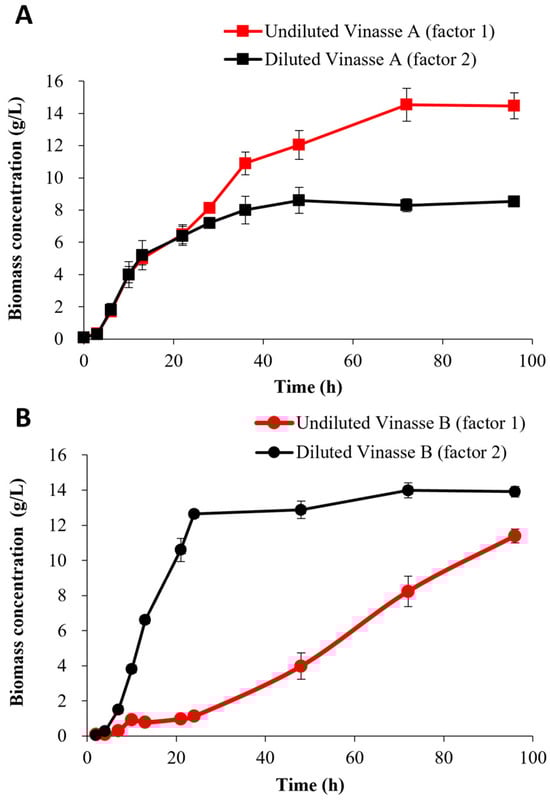Growth kinetics of R. toruloides strain in two vinasse samples. (A) Cell growth in undiluted vinasse A (factor 1) and diluted vinasse A (factor 2). (B) Cell growth in undiluted vinasse B (factor 1) and diluted vinasse B (factor 2). Each point represents the mean ± SD of three samples from a representative experiment.