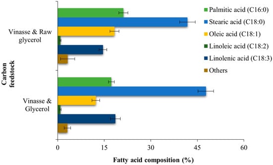 Although the lipid content and yield could vary with the different proportions of vinasse and with the use of either purified or industrial glycerol, the fatty acid profiles observed under the tested conditions generally corresponded to those reported by other researchers for various oleaginous yeast species [,,,]. Consequently, it can be inferred that the combined use of vinasse and industrial glycerol as a carbon source did not substantially affect the quality of the microbial oils, which are intended for use as raw materials in biodiesel production.