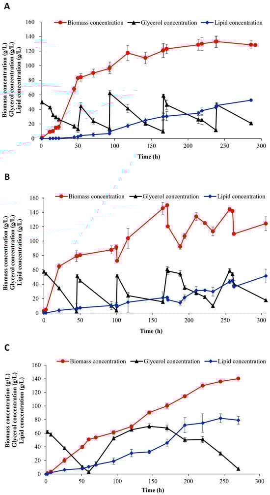 In terms of the behavior of glycerol, as shown in Figure 6C, the glycerol concentration rose to a peak of 72.3 ± 3.8 g L−1, with the lipid accumulation rate reaching 0.98 g L−1h−1. Subsequently, glycerol accumulation ceased, with its concentration starting to decline as the glycerol consumption rate increased. As a result of this strategy, a biomass concentration of 136.0 ± 1.9 g L−1 and a lipid content of 52.5 ± 5.5% were reached, resulting in a lipid productivity of 0.30 ± 0.04 g L−1h−1 and a total dry biomass of 523.6 ± 2.4 g.