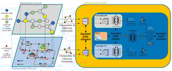 Preparation: The label side creates a key pair, and the DN and TN initialize local submodel parameters and . The encrypted method applied in the federated framework is partial homomorphic encryption (PHE), which consists of key pair generation, encryption, and decryption.