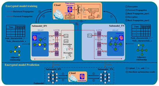 Step ②: The TN and DN submodel results and are input into the time-aware attention module for attention score calculation. This assigns different attention scores to data information from different participants, equivalently alleviating the problem of characteristic distribution skew of DN and TN from the perspective of local data aggregation. The cloud calculates the global encryption loss through MSE.